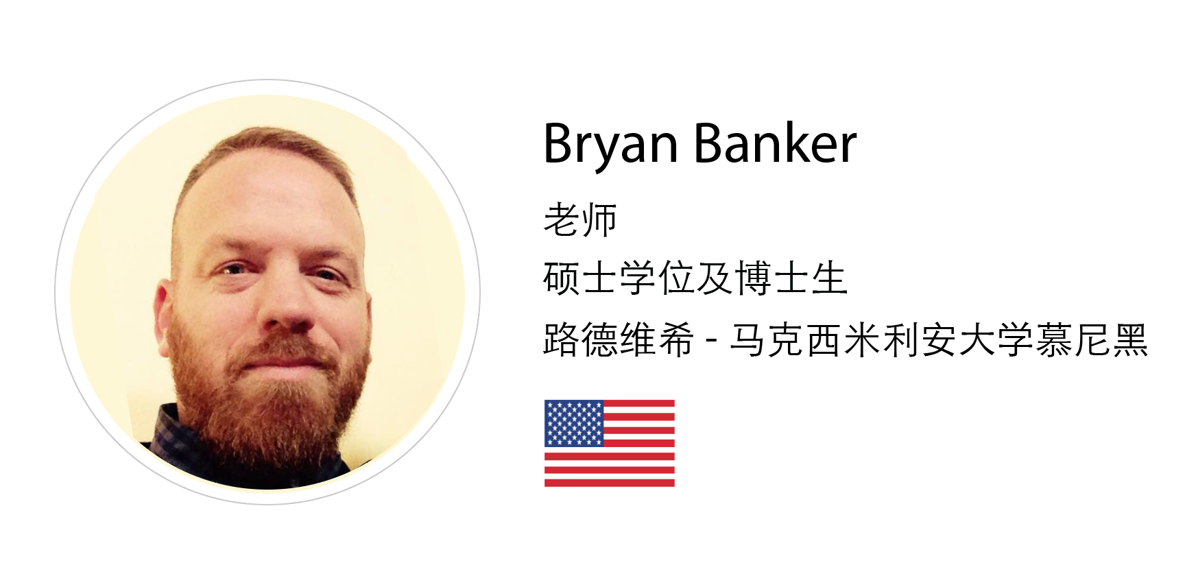 Bryan Banker来自美国,是一位就读于慕尼黑大学的博士生,他拥有海德堡大学硕士学位,以及西敏寺学院学士学位。 Banker先生曾接受邀请出席多个位于不同国家的学术研讨会,并同时到访过英国﹑菲律宾﹑意大利﹑墨西哥﹑瑞士﹑德国﹑荷兰﹑丹麦﹑瑞典﹑法国及西班牙等三十多个国家。 Banker先生对世界各地的文化都有一定认识,使他在教授英语时,不但丰富了教学内容,也大大提升了教学趣味。